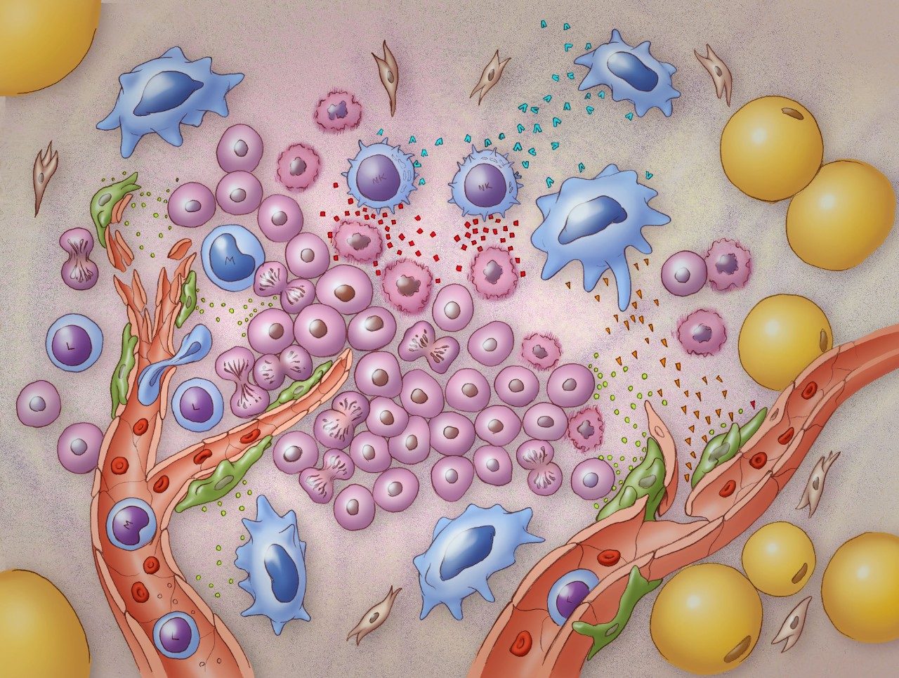 The tumor microenvironment is the ecosystem that surrounds a tumor inside the body. It includes immune cells, the extracellular matrix, blood vessels and other cells, like fibroblasts. A tumor and its microenvironment constantly interact and influence each other, either positively or negatively.