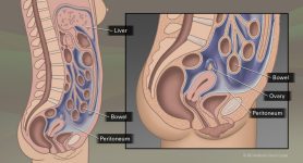Peritoneal cancer can spread all over the abdomen. I describe it to patients like a powdered donut. A powdered donut has small bits of powder all over it. With peritoneal cancer, there are tiny little nodules that exfoliate throughout the abdomen and pelvis. Sometimes, it can spread to the liver and bowel, but in other cases, the disease is just on the surface of these organs.