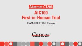 AIC100 is a third generation CAR T cell therapy that works by binding to ICAM-1 on tumor cells to eliminate them. The CAR product co-expresses a protein, called somatostatin receptor 2, which allows clinicians to monitor the therapy’s effectiveness with a specialized positron emission tomography (PET) scan.