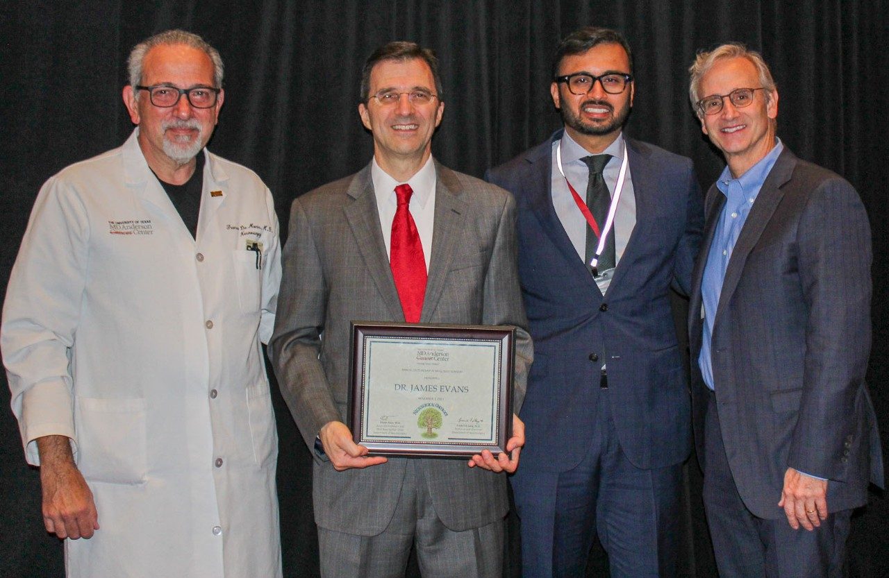 Dr. Evans receives a certificate. From left: Franco DeMonte, M.D., James J. Evans, M.D., Shaan Raza, M.D. and Frederick Lang, M.D.