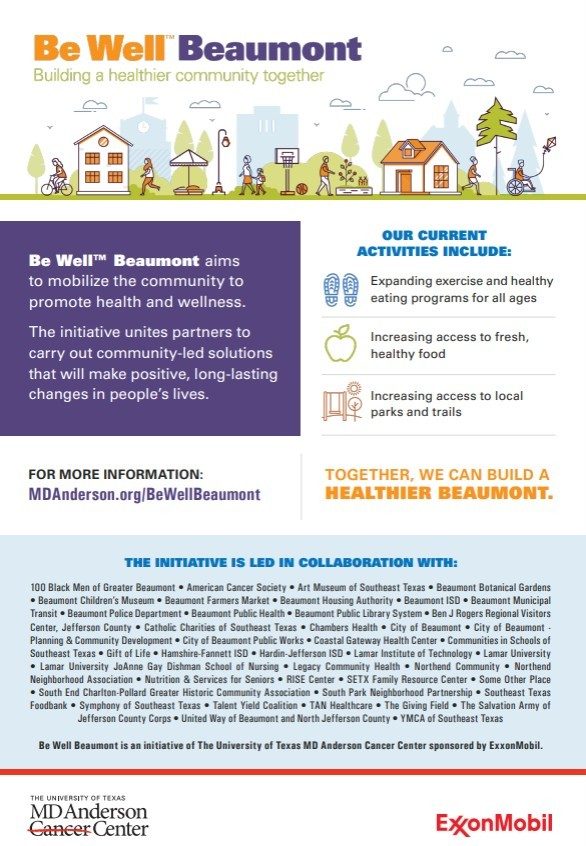 Be Well™ Beaumont is an initiative of MD Anderson sponsored by ExxonMobil. We aim to mobilize the community to promote wellness and stop cancer before it starts.